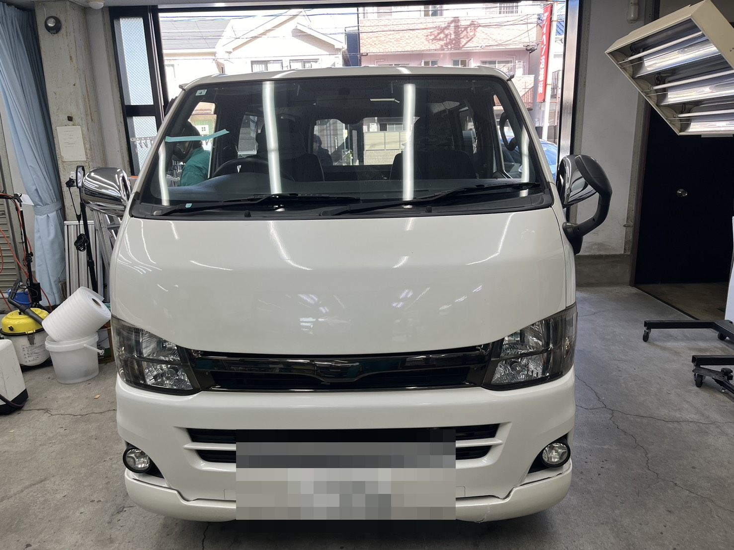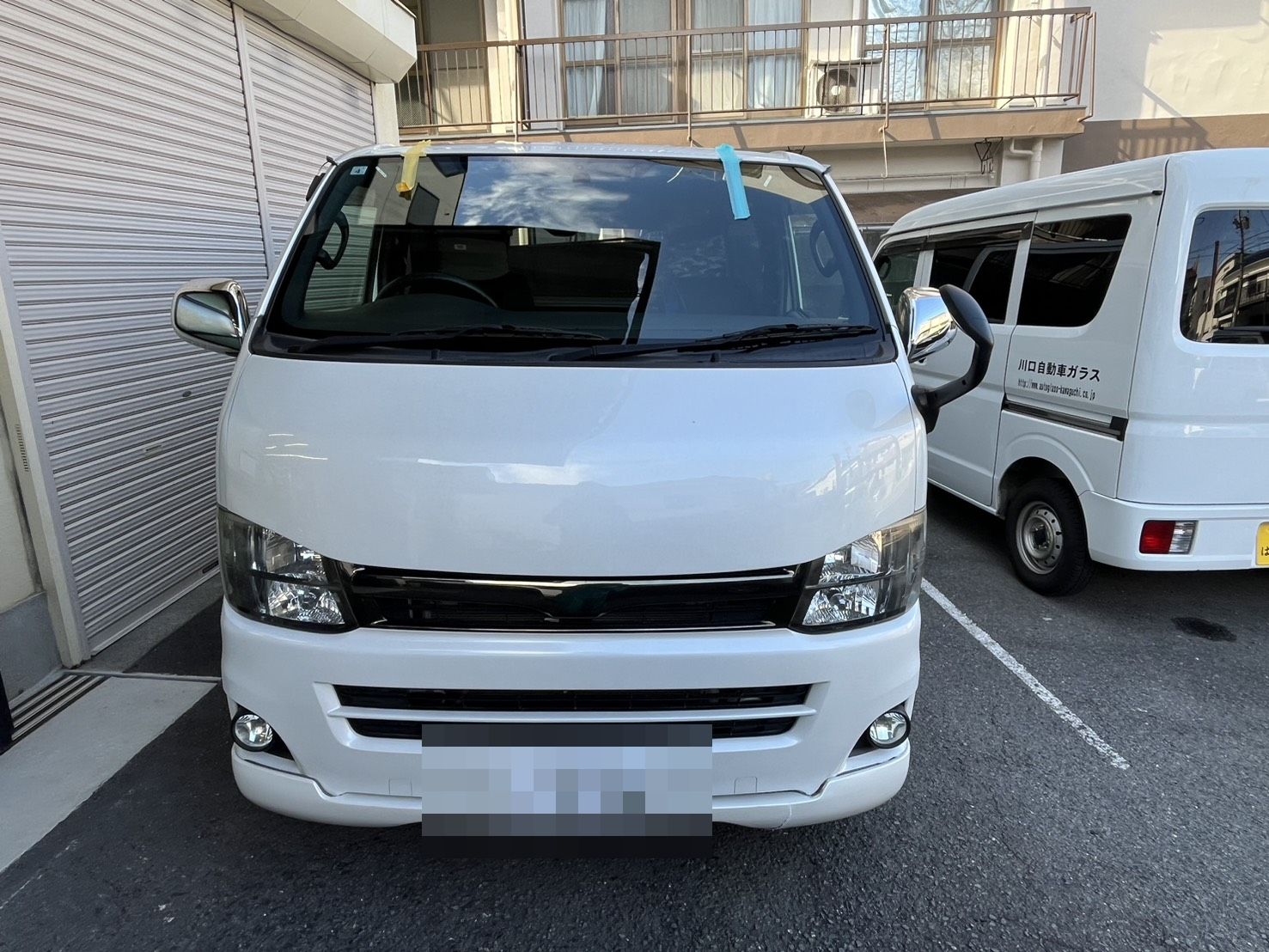 お客様から、トヨタ ハイエース フロントガラス交換のご依頼をいただきました。ありがとうございます。
