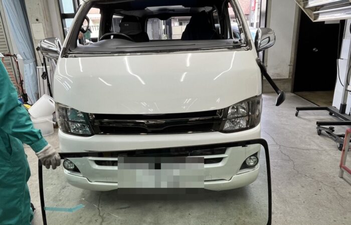 お客様から、トヨタ ハイエース フロントガラス交換のご依頼をいただきました。ありがとうございます。